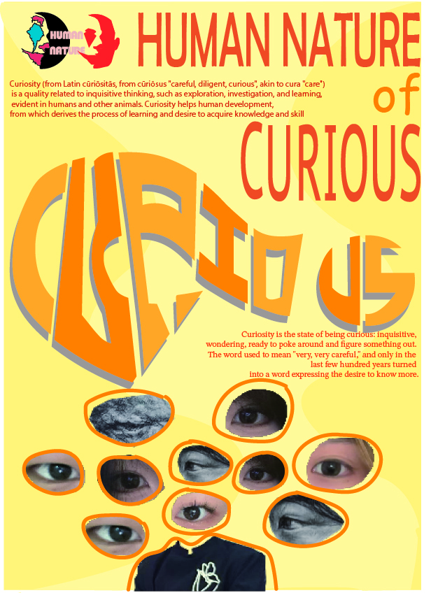For the second poster I used the word curious as the main word, I connected the question mark to the word curious to form a question mark made up of the letters of the word curious, and the many eyes below are photos of many of my real life friends, and some of the eyes of my paintings, all of them very banal people and things, the quality of curiosity that exists in every human being.