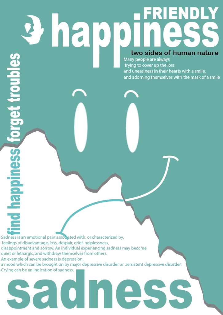 The third poster I used is similar to the form of a book cover, using a broken book as a poster, the content of the book is a smiley face, but the cover of the book was torn off only half of the smiley face, and half of the crying face, using this form to express that in fact, a lot of people are not happy with their daily life, but more sadness, and use the mask of a smile to modify the sadness of their own. In fact, the smile is important, but to come from the heart, is really happy to be happy, to find the beauty of life.