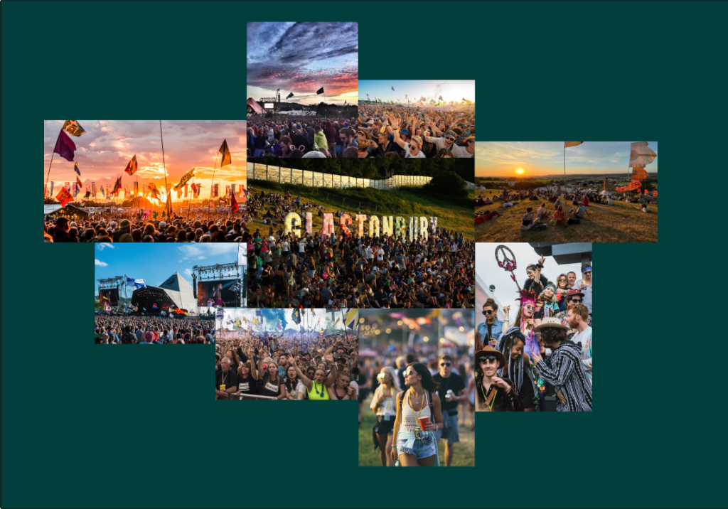 I chose to put the glastonbury festival themed photo in the middle, more so with the festival name as the main factor, and wrapped it up with documented photos of the festival over the years, mixed with vibrant colourful images.