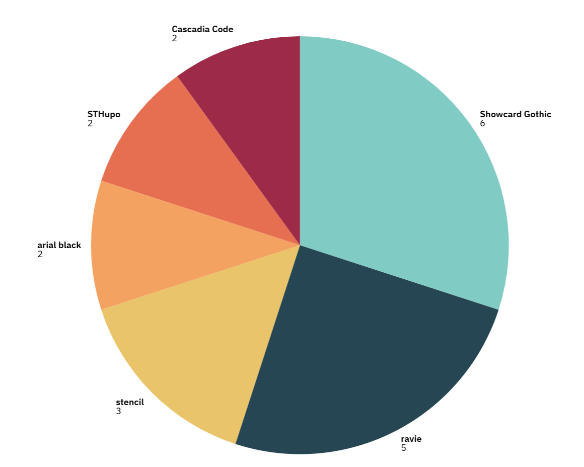 The beginning of the text design is not the last font showcard gothic, the beginning of only the first five fonts, most people choose between the third font in the fourth font, choose the third font because you want to jump like a musical note, there is a kind of spiritual beauty, but too messy. The fourth font is a very formal print font, more simple and easy to understand, more formal, but and the music festival theme is a bit incompatible with the joyful and lively, and thus ultimately chose the last type of fonts. Finding the six fonts and re-doing the user research resulted in the following pie charts.Finally decided to use this version of the font.