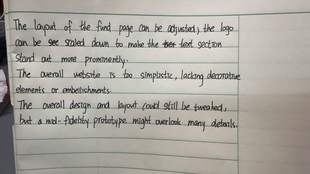 However, I didn’t fully incorporate all feedback. Some suggestions didn’t align with my vision for the site or demonstrated a lack of understanding of mid-fidelity prototyping—like comments about pages being too plain or lacking decorative elements. Since I plan to add colors and design elements in the high-fidelity version, I avoided major changes at the mid-fidelity stage.